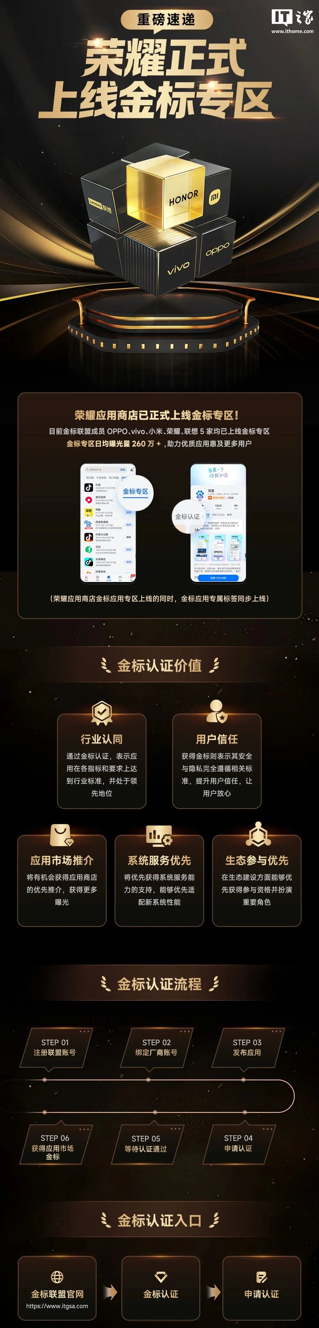 IT之家1月14日消息,移动智能终端生态联盟今日宣布,荣耀手机应用商店正式上线金标专区。目前金标联盟成员OPPO、vivo、小米、荣耀、联想5家均已上线金标专区,专区日均曝光量超260万。据介绍,获得金标的应用表示其安全和隐私完全遵循相关标准。