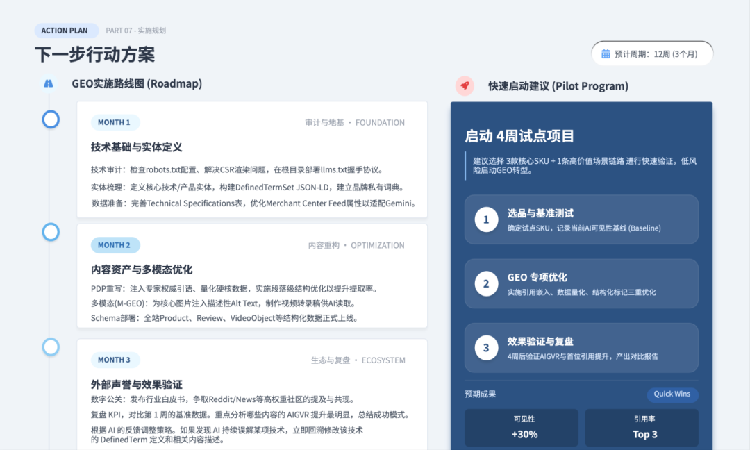最后,Riven提出了涵盖引用权威、统计数据、结构化数据、知识图谱、多模态内容等八个维度的GEO优化框架。由于大模型还在不断探索和迭代中,品牌可以制定“90天行动计划”,方便随时调整。首月夯实技术基础与实体定义;次月优化内容资产与多模态呈现;第三月聚焦前台数据精准化与效果测试,以此类推不断优化。
