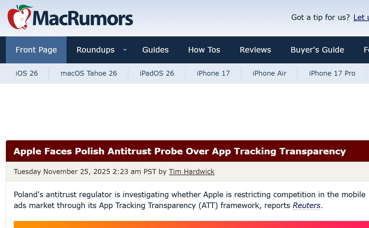 【环球网科技综合报道】11月26日消息,据macrumors援引路透社报道,波兰反垄断监管机构 UOKiK正在对苹果公司应用程序跟踪透明度(AT&T)框架启动调查,质疑该政策限制第三方应用收集跨应用数据,从而偏袒苹果自有广告服务,涉嫌滥用市场支配地位。若指控成立,苹果恐被处以其在波兰年营业额最高 10% 的罚款。